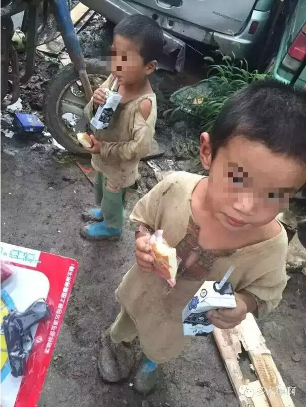 新聞圖片可以看到,一對小朋友,其實并不是那么能看得出哪個小朋友是女孩兒。一個小臉兒稍微圓一點的小朋友穿著藍色的滿是灰塵的褲子,上身的小T恤則全是污漬。另外一個稍微瘦一點的小朋友,T恤肩膀的一端已經(jīng)耷拉下來,明顯比較大的雨靴上都是泥。他們在一群垃圾之間,他們生活在省會城市南京。