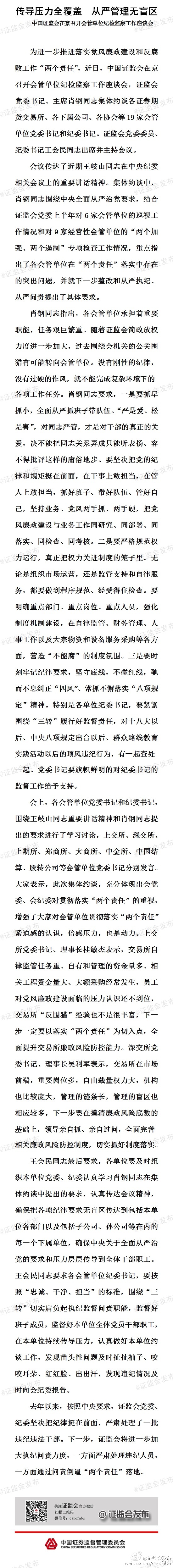 第一是證監(jiān)會近日在京召開會管單位的紀檢監(jiān)察工作,他表示為進一步推進黨風廉政建設(shè),近日證監(jiān)會主席肖鋼集中約談了19家會管單位的黨委書記和紀委書記。
