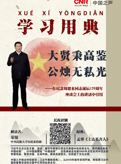 中國之聲特別策劃《習(xí)近平最新用典》,梳理習(xí)近平最新重要講話和文章中引用的經(jīng)典名句。今天的《習(xí)近平最新用典》,請看習(xí)近平在紀(jì)念周恩來誕辰120周年座談會上的講話中使用的“大賢秉高鑒,公燭無私光”。解讀嘉賓:中央民族大學(xué)歷史系教授蒙曼。