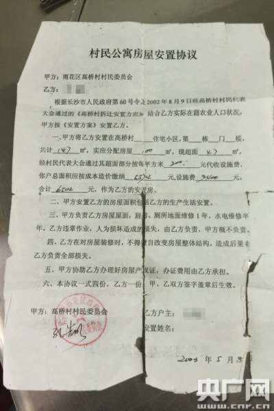 村民陳女士告訴記者,1998年開(kāi)始,坐落于雨花區(qū)的高橋村成了城市擴(kuò)容點(diǎn),按照規(guī)劃,這里是“湖南省最大的市場(chǎng)群”以及城市交通樞紐,村民的家隨后被拆遷。拆遷后他們先是在一個(gè)臨時(shí)安置點(diǎn)居住,2004年搬進(jìn)了新建的“安置房”,直到今天,還沒(méi)有拿到任何權(quán)證!2004年,給我們住的安置房,到了現(xiàn)在,12年了,我們一直都沒(méi)有任何權(quán)證,而且這種房子還是違法建筑!标惻空f(shuō)。