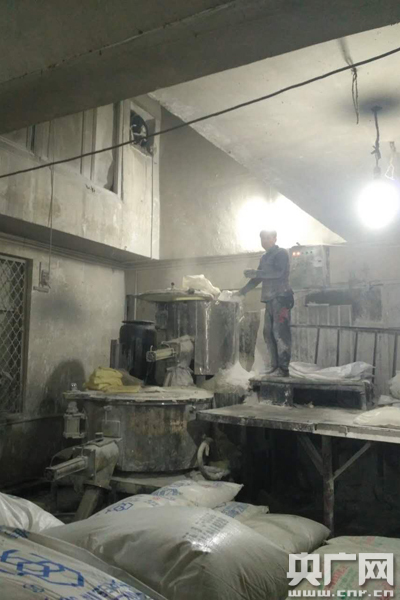 車間二樓,落滿了白色粉塵,作業(yè)人員并沒有佩戴口罩等防護(hù)措施,記者一走進(jìn)去就嗆得感覺整個(gè)肺都不舒服。環(huán)保部華北督查中心二處副處長劉傳義一下指出了上料口長期無組織粉塵排放的問題。
