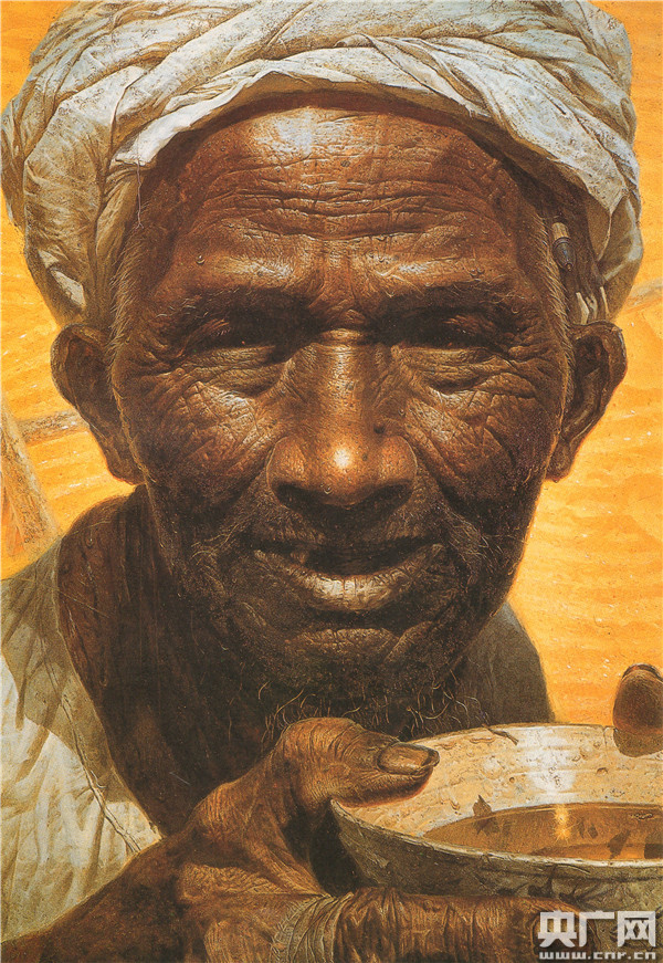 高2米、寬1米5的畫布,金色背景上,一張古銅色的老農(nóng)面龐,一道道溝壑般的皺紋,殘缺的牙齒、干裂的嘴唇、稀疏的須發(fā)纖毫畢現(xiàn),雙手捧著一只粗瓷茶碗,指縫中還殘留著泥垢,眼神在幽暗的光影里朦朧不清。