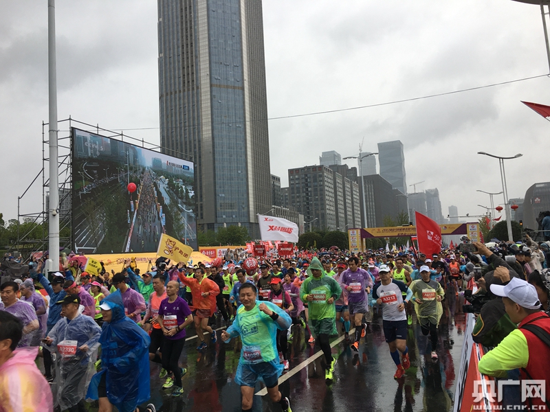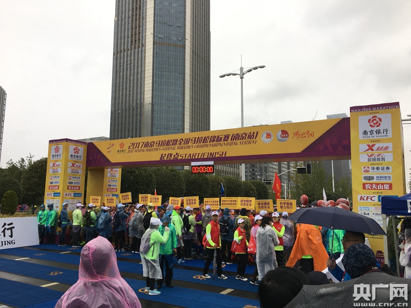 南京氣象臺預報,今天全天陰有陣雨,東北風4到5級。2.8萬名報名選手已經集結完畢,正在開跑,有的選手準備了薄薄的一次性雨衣,有的為不增加阻力,冒雨參賽。目前雨量不大,記者從現(xiàn)場了解,線路正常,沒有因為積水而影響賽道和線路。