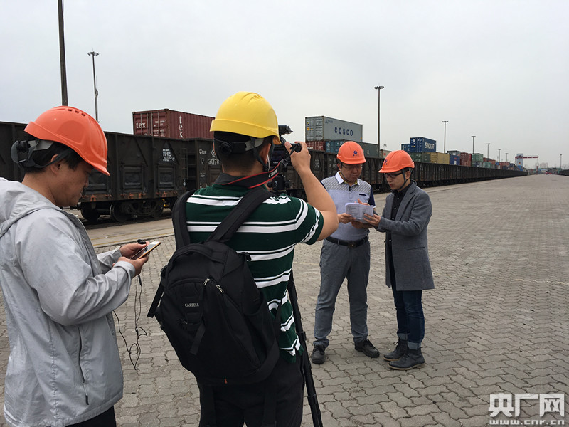 央廣記者柴安東(右一)、央視攝像趙迎晨(左二)在采訪陸橋國際貨運(yùn)代理有限公司報(bào)關(guān)中心經(jīng)理王欣(右二)