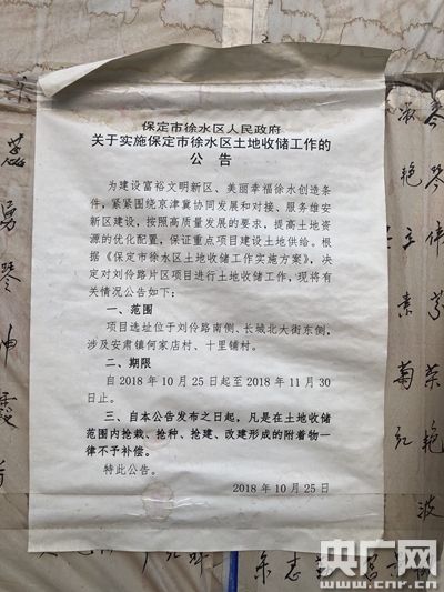 貼在安肅鎮(zhèn)何家店村公示欄上的收儲(chǔ)公告。(央廣記者 管昕 攝)