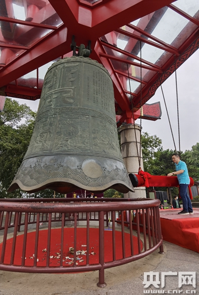 不少游客選擇撞擊“千禧鐘”祈福 (央廣記者常亞飛 攝)