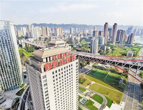 南岸區(qū)南濱路能源大廈,中國(重慶)自貿(mào)試驗區(qū)的字樣十分醒目。(重慶日報資料圖片)