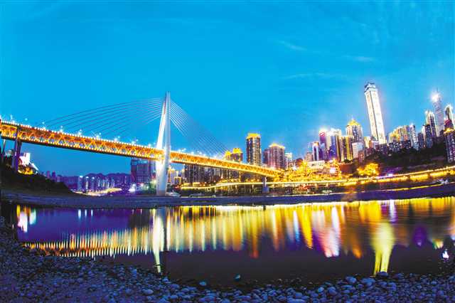 千廝門大橋和渝中區(qū)的建筑倒映在水面。記者 蘇思 攝 (本報(bào)資料圖片)
