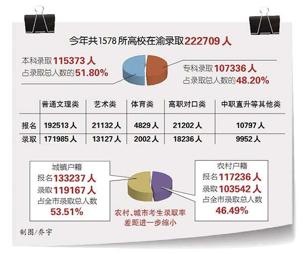 8月14日,市教育考試院發(fā)布消息,我市2018年普通高校招生錄取工作全部結束。今年全市高考報名共250473人,在渝招生高校共1578所,各類各批次共錄取222709人,本、?其浫∪藬(shù)幾乎各占一半。值得提醒的是,未被錄取的考生還有最后一次專科補錄的機會,填報志愿的時間是9月23日14:00至9月24日12:00。