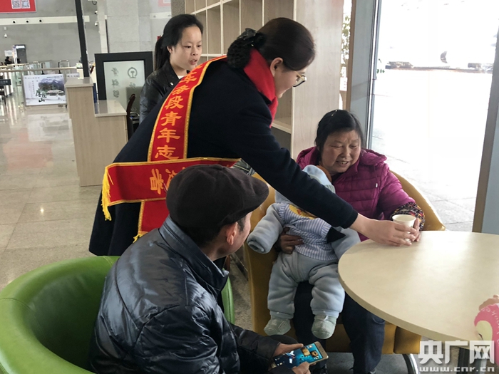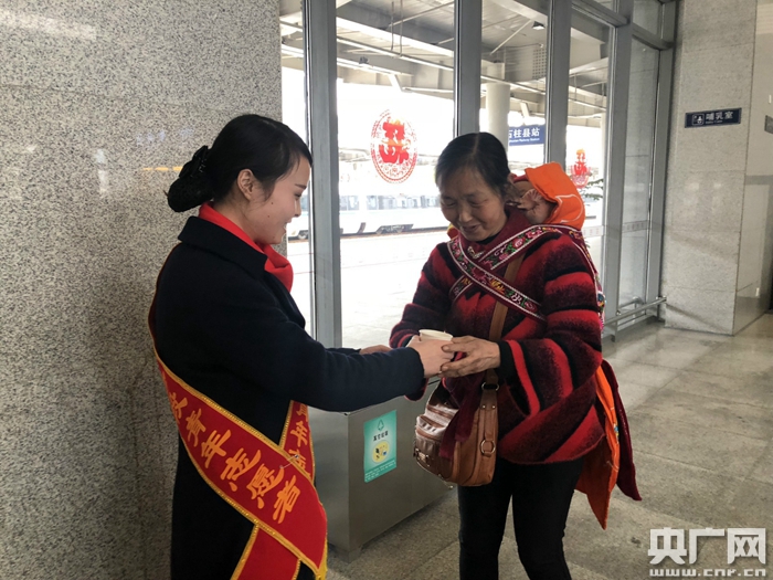 央廣網(wǎng)重慶2月14日消息(記者趙聰聰 通訊員苗艷娜)“沒想到,我一下公交車,就有車站的志愿者接我,一路把握攙扶進(jìn)站到這里休息。又是幫拿行李,又是參茶倒水的,這服務(wù)沒得說!2月14日,正坐在重慶涪陵車務(wù)段石柱縣站黨群服務(wù)站的一位70多歲大爺指著一旁的志愿者開心地說道。