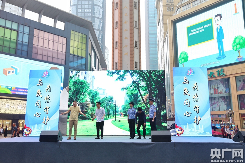 解放碑活動現(xiàn)場表演的防詐騙情景劇(央廣網(wǎng)發(fā) 重慶市公安局供圖)