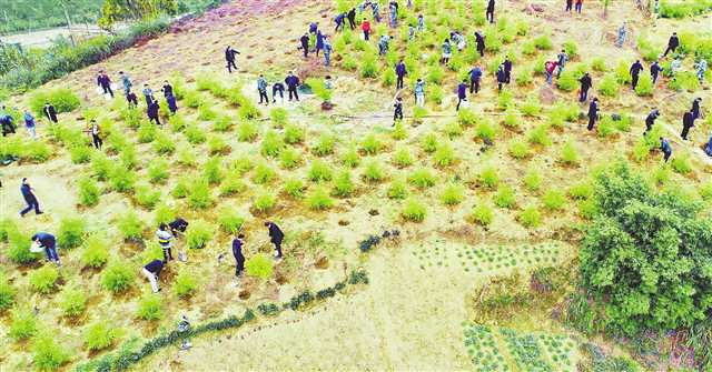 3月12日,萬盛經(jīng)開區(qū)萬東鎮(zhèn),人們?cè)诨纳狡律现矘湓炝。近年來,萬盛加快采煤沉陷區(qū)生態(tài)環(huán)境修復(fù),開展規(guī)模植綠行動(dòng)和礦山地質(zhì)環(huán)境治理,將綠色還給礦山。通訊員 王瀘州 攝