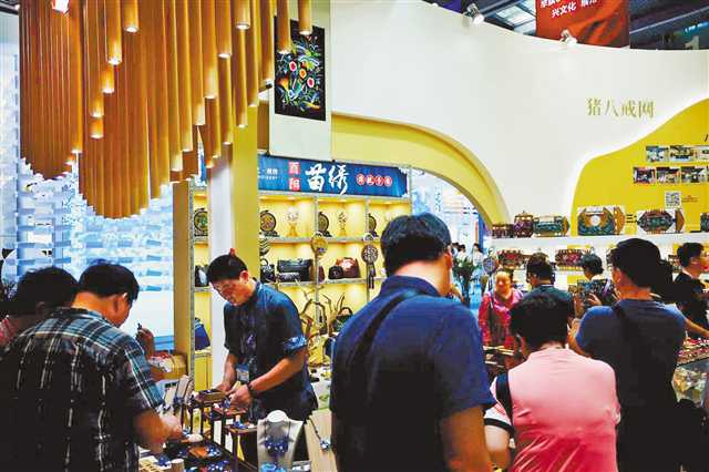 五月十六日,第十五屆深圳文博會(huì)主會(huì)場,酉陽縣子月苗族文化傳播有限責(zé)任公司帶來的酉陽苗繡受到觀眾追捧。記者 黃琪奧 攝