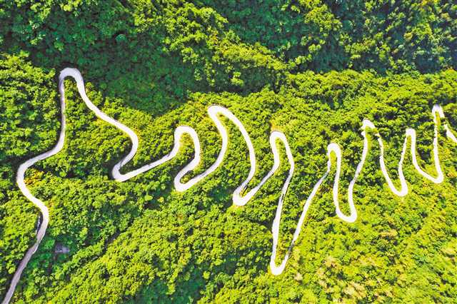 這條路位于海拔1500多米的小朝門山,蜿蜒盤旋,有41道拐,甚是壯觀。這條扶貧公路不僅帶動(dòng)了當(dāng)?shù)氐漠a(chǎn)業(yè)發(fā)展,也逐漸成為一條各地游客關(guān)注的自駕游公路。(特約攝影 楊敏)
