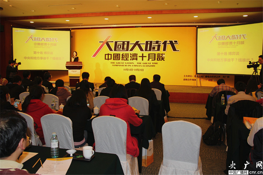 1025日,由中央人民廣播電臺經(jīng)濟之聲、央廣網(wǎng)主辦的《大國大時代----中國經(jīng)濟十月談》系列時事報告會之十“博弈談”,在廣電國際酒店舉行。今天的主題是《博弈談:中央和地方事誰干?錢誰出》。圖為報告會現(xiàn)場 (央廣網(wǎng) 于琦/攝)