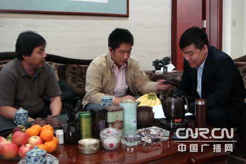 圖為中央臺記者田彤(左)、賈鐵生采訪大連鵬生企業(yè)董事長孫明楠(右)