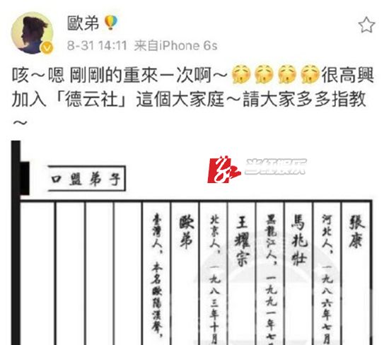 紅網(wǎng)長沙8月31日訊(時刻新聞記者 朱青)離開《天天向上》之后的歐弟8月31日宣布加盟德云社,成為郭德綱旗下弟子。歐弟在微博中曬出德云社的“家譜”,自己的名字赫然在列。郭德綱也更新微博曬德云社“家規(guī)”,并宣布將兩位“云”字輩的徒弟逐出師門。