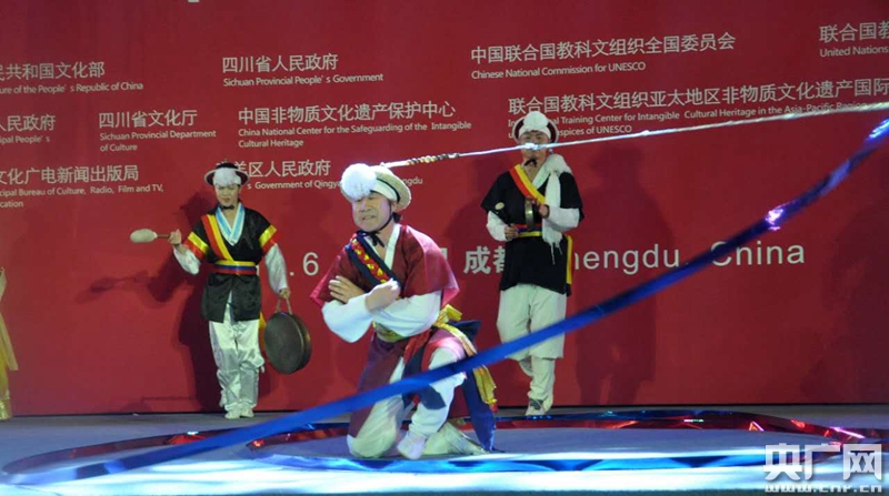 舞蹈《朝鮮象帽舞》。 央廣網(wǎng)北京6月10日消息 6月10日,“文化和自然遺產(chǎn)日”全國非物質文化遺產(chǎn)主場活動在四川成都國際非遺博覽園啟動。 本屆非遺節(jié)將以“世界風、中華節(jié)、中華戲、中華藝”為主線,統(tǒng)籌統(tǒng)攬各項節(jié)會活動。來自全國及世界各地的傳統(tǒng)歌舞、說唱藝術,以及民族節(jié)慶項目將在這里展演;除了來自世界各地的精彩表演之外,同時,來自15個國家的傳統(tǒng)手工藝項目也在現(xiàn)場進行展示。 -