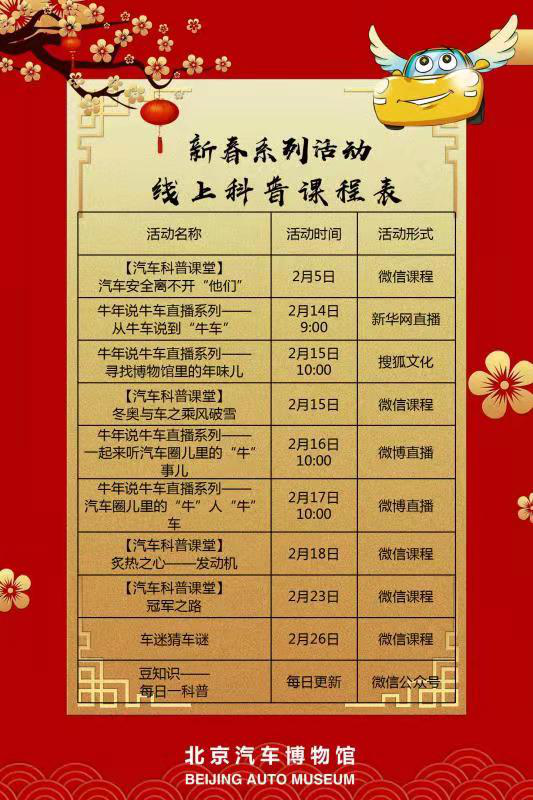 除了線上精彩紛呈的年味活動,線下活動也別出心裁。針對疫情防控情況,汽車博物館將采取限量、預約、錯峰入館等措施,除夕至初二(2021.2.11—2021.2.13)閉館,初三至初六(2021.2.14—2021.2.17)正常開放,開放時間為9:00-17:00。觀眾可在“北京汽車博物館微信公眾號”進行預約參觀,初三至初六每天進館前10名的觀眾可以領(lǐng)取新年福袋一個。