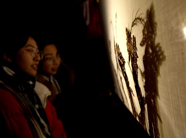 ↑2月12日,在甘肅省定西市渭源縣清源鎮(zhèn)崔家河村,觀眾在欣賞皮影戲。