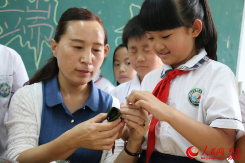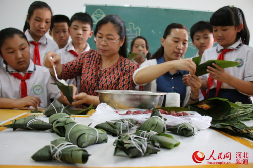 圖為6月4日河北省邯鄲市廣平縣第二實(shí)驗(yàn)小學(xué)學(xué)生在老師的幫助下學(xué)習(xí)包粽子。