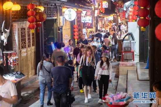 游客在湖南省永順縣芙蓉鎮(zhèn)內(nèi)游玩(2020年5月15日攝)。新華社發(fā)(陳思汗 攝)