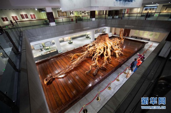 在湖南省常德市桃花源風景名勝區(qū)“桃源工”藝術(shù)博物館,游客在觀看巖柳根雕作品《桃花源》(2019年11月14日攝)。新華社發(fā)(陳思汗攝)