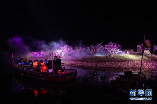 游客在湖南省常德市桃花源風景名勝區(qū)乘船觀看實景演出《桃花源記》(2019年11月13日攝)。新華社發(fā)(陳思汗 攝)