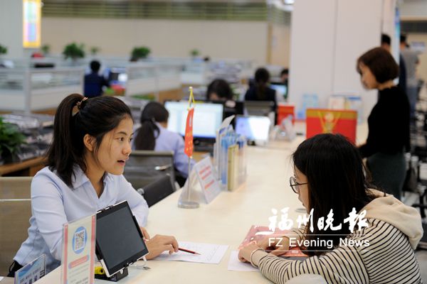 昨日上午,經(jīng)辦人員陳曉燕(左)在福州自貿(mào)片區(qū)綜合服務(wù)大廳幫市民辦理業(yè)務(wù)。