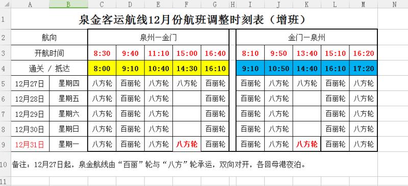 投入運(yùn)營(yíng)后,泉金航線每周四和周日泉金航線將執(zhí)行10個(gè)航班,其余每天執(zhí)行8個(gè)航班。據(jù)了解,“百麗”輪滿(mǎn)載客位量180人,新客運(yùn)的投入運(yùn)營(yíng),將極大緩解目前泉金航線的運(yùn)營(yíng)壓力,