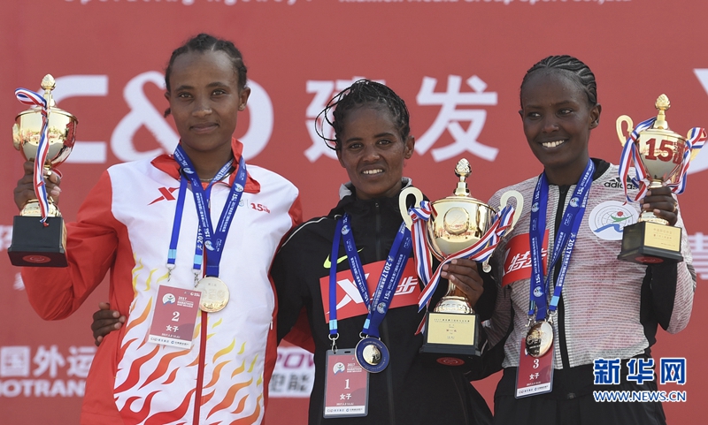 1月2日,冠軍埃塞俄比亞選手萊米·貝爾哈努(中)等在頒獎(jiǎng)儀式上。新華社記者林善傳攝