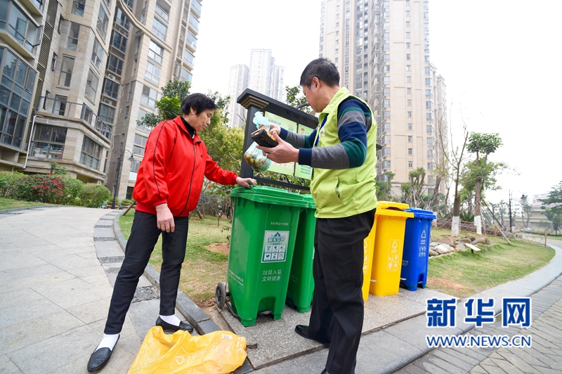 3月29日,廈門市垃圾分類示范小區(qū)天湖城小區(qū)內(nèi),垃圾分類督導(dǎo)員蘇永順(右)將邱彩仙阿姨送來的廚余分類垃圾掃碼記錄后投入分類垃圾箱。 新華社記者姜克紅攝 當(dāng)日,廈門市垃圾分類示范小區(qū)海滄天湖城小區(qū)內(nèi),79歲的邱彩仙阿姨將一袋廚余垃圾投放至小區(qū)廚余垃圾分類箱,隨后這袋垃圾被廚余垃圾專用車轉(zhuǎn)運至廈門市垃圾分類處理廠。在這里經(jīng)過流水線分揀后,其中剩菜剩飯等有機(jī)物被輸送至厭氧發(fā)酵間發(fā)酵產(chǎn)生甲烷氣體燃燒發(fā)電,而塑料、紙張等可燃垃圾被再次轉(zhuǎn)運至附近的廈門后坑垃圾焚燒發(fā)電廠進(jìn)行焚燒發(fā)電。至此,邱阿姨這袋廚余分類垃圾完成了“變身之旅”,被轉(zhuǎn)化為可利用的電能。 據(jù)了解,廈門目前日產(chǎn)各類垃圾5000余噸,其中約1800余噸被用來焚燒發(fā)電,2600余噸被壓縮填埋,剩下的約600余噸廚余分類垃圾被進(jìn)行生物質(zhì)能轉(zhuǎn)換再生利用。 近年來,廈門市穩(wěn)步推進(jìn)垃圾分類工作,正加快建立分類投放、分類收集、分類運輸、分類處理的生活垃圾分類處理系統(tǒng),并通過設(shè)立的19個垃圾分類示范小區(qū)和學(xué)校垃圾分類教育,宣傳垃圾分類的重要性,提高全民參與熱情。 -