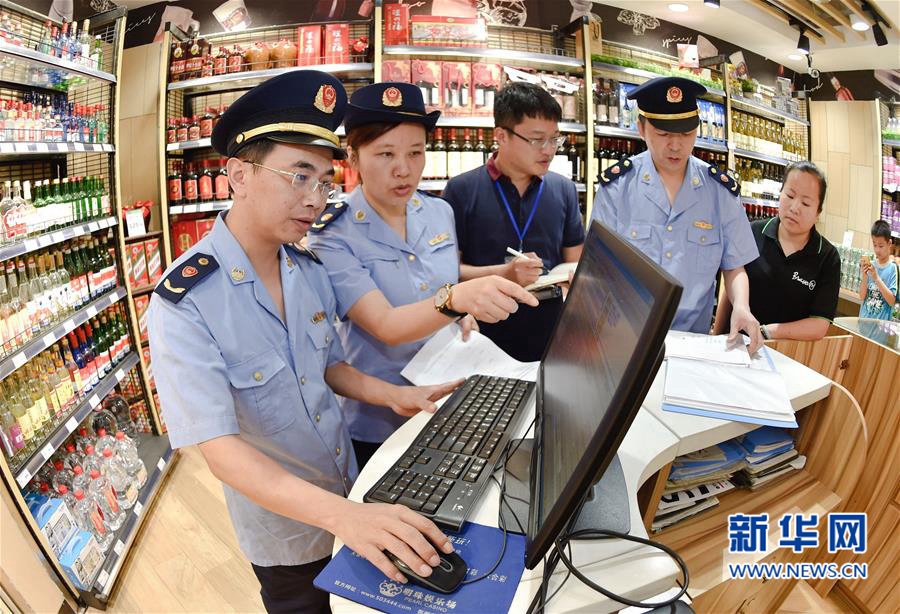 5月24日,在福州市臺江區(qū)一家超市的酒類專區(qū),“四風”督查組人員在核查大宗團購及提貨記錄。新華社記者 宋為偉 攝