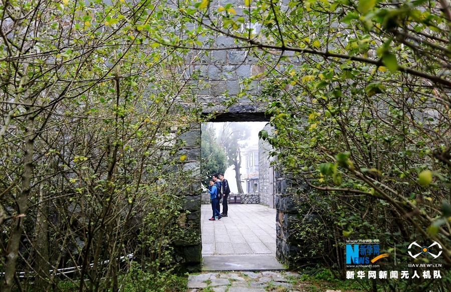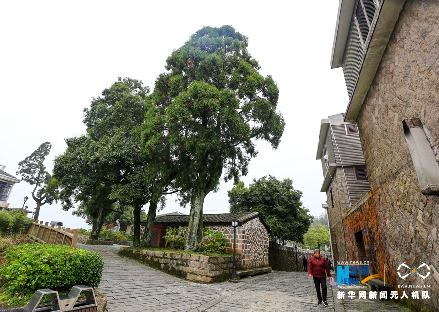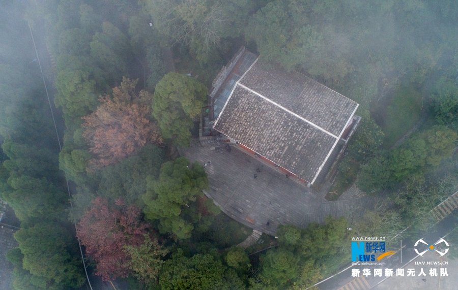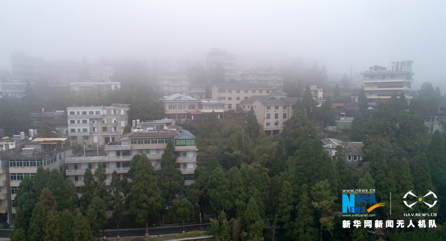 這是在鼓嶺柳杉王公園一帶拍攝到的樹木和民居,遠(yuǎn)處濃霧籠罩(11月6日無(wú)人機(jī)拍攝)。新華網(wǎng) 肖和勇 攝