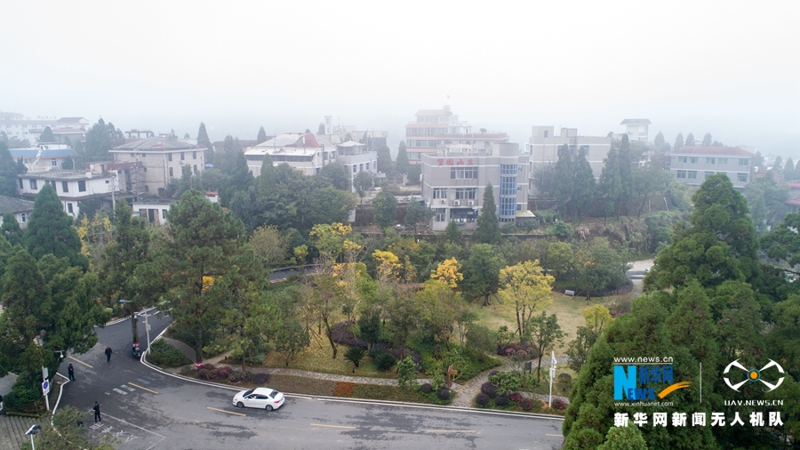 鼓嶺宜夏村,民居和樹木籠罩在濃霧中(11月6日無(wú)人機(jī)拍攝)。新華網(wǎng) 肖和勇 攝