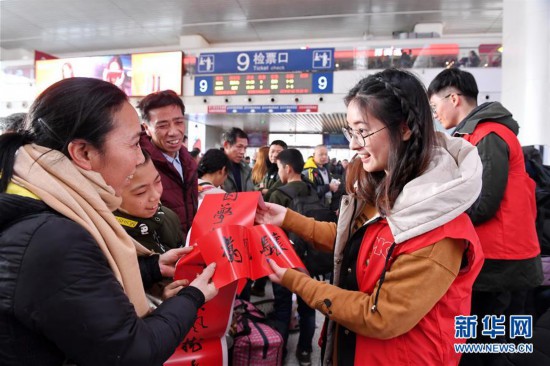 當(dāng)日,溫暖回家路——“青春志愿行 奉獻(xiàn)新時(shí)代”暖冬行動(dòng)萬名志愿者在行動(dòng)暨“奮斗的人生是幸福的人生”新春贈(zèng)聯(lián)等活動(dòng)在福州火車站舉行。 新華社記者 林善傳 攝