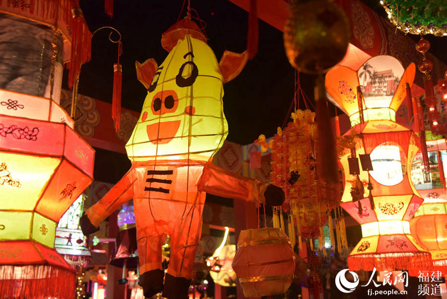 武榮公園花燈展區(qū),最引人注目的是那些充滿童趣的花燈。這里展出的200余盞花燈中,有100盞是來自學(xué)校師生的手工創(chuàng)意花燈。抬頭望去,熊貓、小船、菠蘿、月亮、財(cái)神爺、獅子頭等形態(tài)各異的造型花燈爭(zhēng)相競(jìng)艷,其中,還有不少豬年元素和南安本土文化特色元。