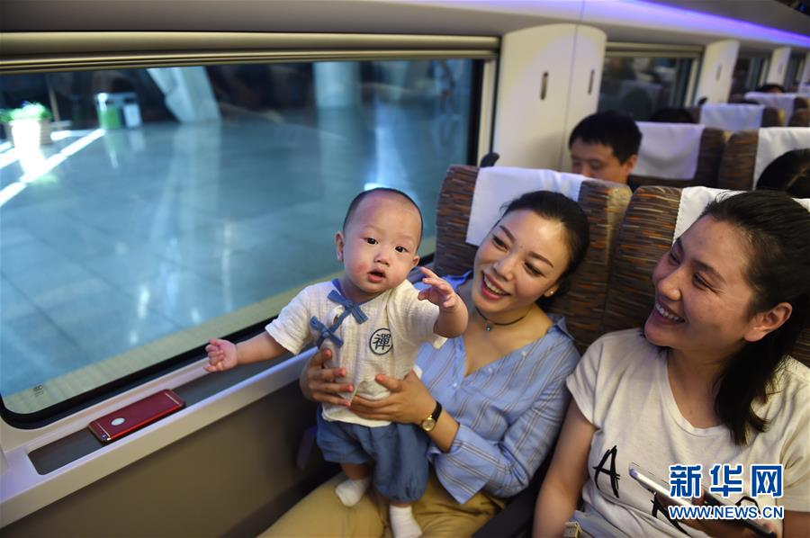 6月26日,6個半月的小朋友皇甫嘉曄跟隨家人乘坐“復(fù)興號”G123次列車。 當(dāng)日,中國標(biāo)準(zhǔn)動車組“復(fù)興號”在京滬高鐵兩端的北京南站和上海虹橋站雙向首發(fā),分別擔(dān)當(dāng)G123次和G124次高速列車。“復(fù)興號”是由中國鐵路總公司牽頭組織研制、具有完全自主知識產(chǎn)權(quán)、達(dá)到世界先進(jìn)水平的中國標(biāo)準(zhǔn)動車組。 新華社記者鞠煥宗攝 -
