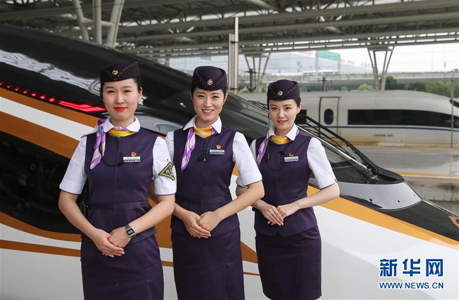 6月26日,在上海虹橋火車站,乘務(wù)人員站在“復(fù)興號”G124次列車旁。 當(dāng)日,中國標(biāo)準(zhǔn)動車組“復(fù)興號”在京滬高鐵兩端的北京南站和上海虹橋站雙向首發(fā),分別擔(dān)當(dāng)G123次和G124次高速列車!皬(fù)興號”是由中國鐵路總公司牽頭組織研制、具有完全自主知識產(chǎn)權(quán)、達(dá)到世界先進(jìn)水平的中國標(biāo)準(zhǔn)動車組。 新華社記者丁汀攝 -