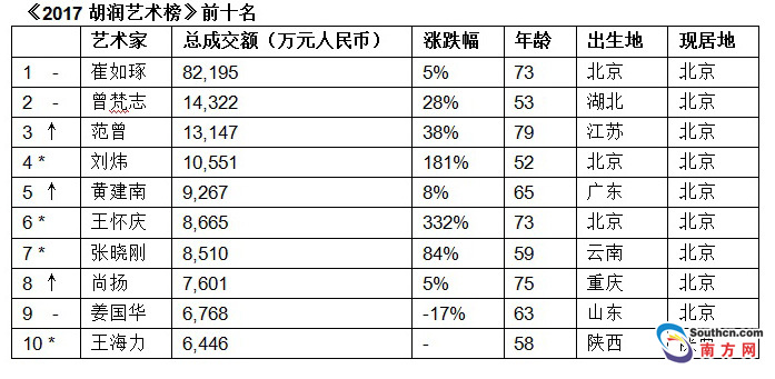 據(jù)南方網(wǎng)報(bào)道,73歲的書(shū)畫(huà)家崔如琢連續(xù)三年蟬聯(lián)胡潤(rùn)藝術(shù)榜榜首,成交額比去年增長(zhǎng)5%,再創(chuàng)新高,達(dá)到8.2億元;53歲的油畫(huà)家曾梵志總成交額1.4億元,比去年增長(zhǎng)28%,衛(wèi)冕第二;79歲的國(guó)畫(huà)家范曾總成交額1.3億元,比去年增長(zhǎng)38%,排名上升1位,重回第三……
