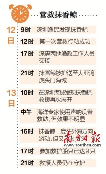 據(jù)南方日?qǐng)?bào)報(bào)道,12日上午,有漁民在深圳東部海域發(fā)現(xiàn)一頭被漁網(wǎng)纏繞的抹香鯨,深圳大鵬新區(qū)的漁政部門展開了緊急救援。當(dāng)天12時(shí)20分,受困鯨魚成功擺脫漁網(wǎng),并游向惠州海域。13日上午10時(shí),救援人員在深圳廖哥角海域再次發(fā)現(xiàn)有擱淺危險(xiǎn)的抹香鯨,深圳與惠州兩市漁政部門繼續(xù)聯(lián)合施救。今日(14日)上午,香港海洋公園、中科院深海研究所等機(jī)構(gòu)的專家將趕往現(xiàn)場(chǎng)研究解救辦法。