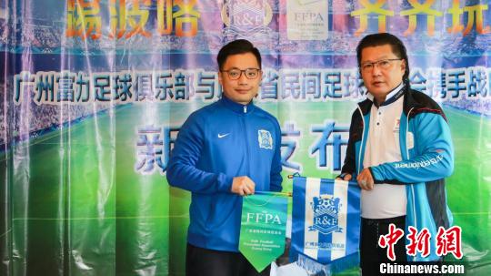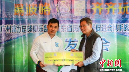 容志行(圖右)代表廣東民促會互贈“廣東省民間足球促進會與廣州富力足球俱樂部攜手戰(zhàn)略合作”牌匾!≡莱彙z