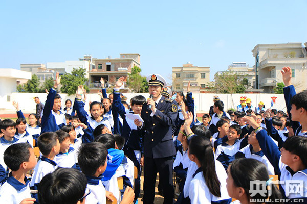 “海事叔叔,坐船為什么要穿救生衣”,“海事阿姨,掉到水里了怎么辦?”“先套再穿扣,交叉在背后,套過中間扣,系緊在胸前,頸部縛帶不能忘,鳴哨示警保安全!痹诿杏鋱@中學和惠州市鹽洲中學的操場上,一群中小學生圍在海事人員身邊,一邊爭先恐后地提問,一邊誦讀水上安全知識口訣。這是海事聯(lián)合教育、團委、公益組織等部門等開展 “水上交通安全知識進校園”宣傳活動的一幕。