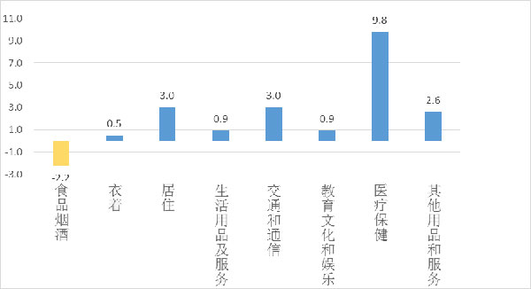 從不同類別看,八大類居民消費(fèi)價(jià)格“七升一降”。其中,醫(yī)療保健類價(jià)格上漲9.8%,居住類價(jià)格、交通和通信類價(jià)格均上漲3.0%,其他用品和服務(wù)類價(jià)格上漲2.6%,生活用品及服務(wù)類價(jià)格、教育文化娛樂類價(jià)格均上漲0.9%,衣著類價(jià)格上漲0.5%;食品煙酒類價(jià)格下降2.2%。