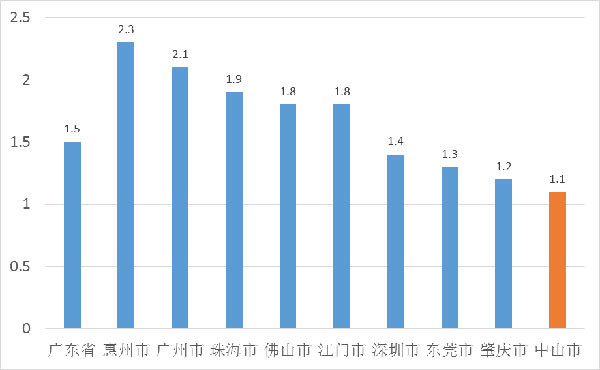 與周邊城市比較,2017年第一季度中山CPI上漲1.1%,比全。ㄉ蠞q1.5%)低0.4個(gè)百分點(diǎn),在珠三角九市中漲幅最低。