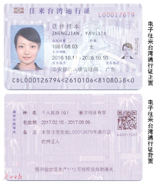 廣州日報(bào)訊 公安部近日通知,決定全面啟用電子往來臺灣通行證,廣東省公安機(jī)關(guān)出入境管理部門自4月24日起開始全面受理電子往來臺灣通行證申請,同時(shí)停止簽發(fā)現(xiàn)行本式往來臺灣通行證。