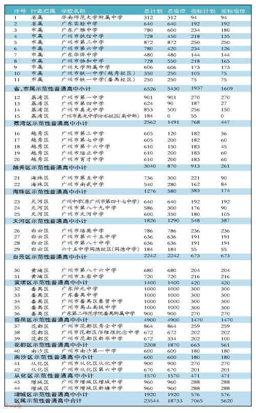 根據(jù)統(tǒng)計(jì),11區(qū)的區(qū)屬示范性高中指標(biāo)中,番禺區(qū)的指標(biāo)計(jì)劃數(shù)最多達(dá)1470,其次是越秀區(qū)913,南沙區(qū)指標(biāo)計(jì)劃數(shù)最少,為180個(gè)。省、市屬示范性普高指標(biāo)到校招生計(jì)劃采取兩級(jí)分配模式。