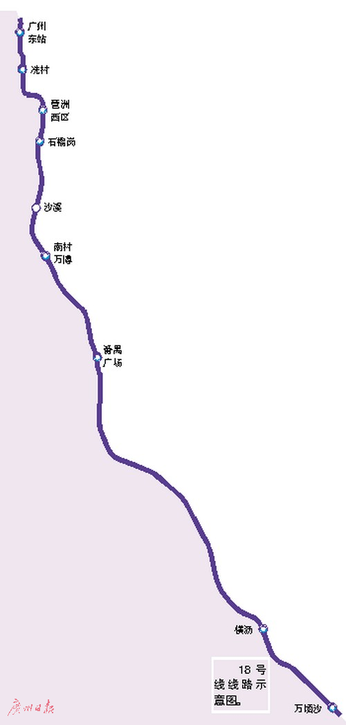 線路北起廣州東站、南至萬(wàn)頃沙樞紐,總長(zhǎng)62.5公里,設(shè)站9座,平均站間距超過(guò)7公里。為實(shí)現(xiàn)廣州市中心與南沙副中心30分鐘快速直達(dá)的時(shí)空目標(biāo),線路采用了最高時(shí)速160公里的系統(tǒng)制式,線路走向盡可能拉直及嚴(yán)格控制沿線車(chē)站設(shè)置數(shù)量。