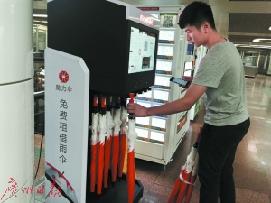 昨日,該共享雨傘租賃點所屬公司CEO沈巍巍告訴記者,廣州是共享雨傘項目落戶的第一座國內(nèi)城市,今年3月31日開始投放,每臺自助借傘機可存放55把雨傘,現(xiàn)在廣州6個地鐵站共投放了1000多把雨傘。