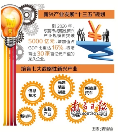 《規(guī)劃》提出,到2020年,東莞市戰(zhàn)略性新興產業(yè)規(guī)模將突破5000億元,增加值占GDP比重達16%。屆時,東莞市將培育出30家百億元產值的龍頭企業(yè),形成新一代信息技術、高端裝備制造、新能源汽車等多個產業(yè)集群。梁維東要求,要重視規(guī)劃的實用性,相關部門要強化責任意識,把規(guī)劃做精、做實,進一步強化規(guī)劃的指導意義。